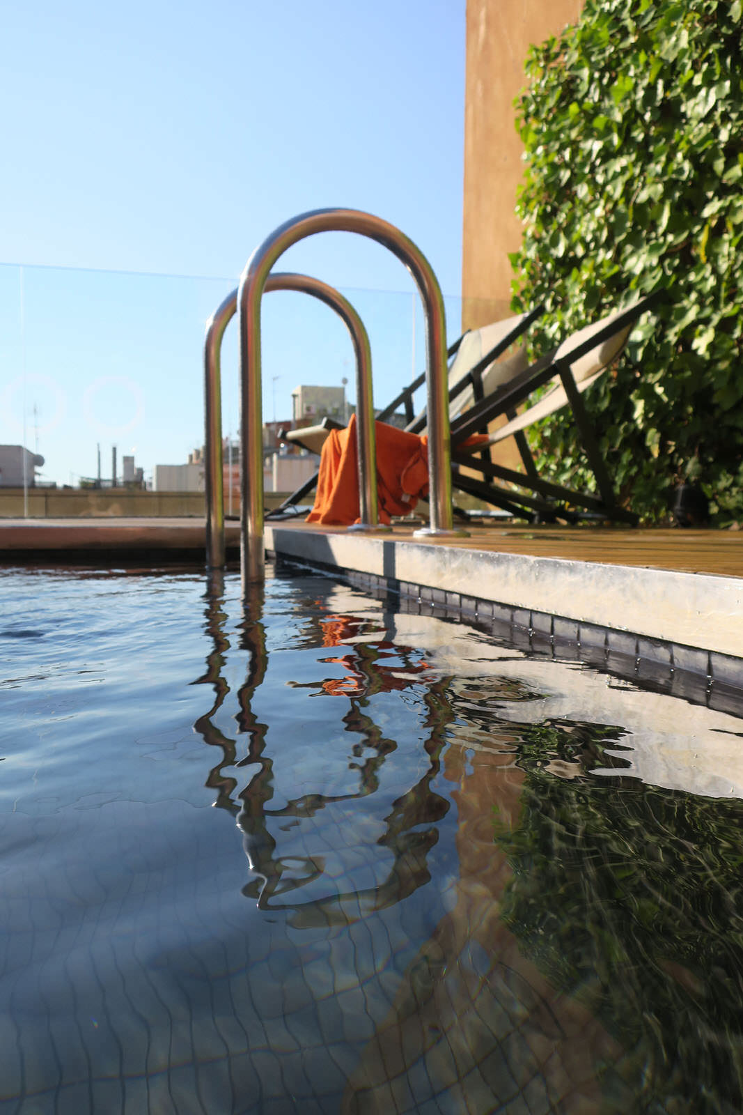 Avant même d’aller petit déjeuner, nous n’avions qu’une envie, aller voir la fameuse piscine sur le toit de l’hôtel ! Quel bonheur en y arrivant, il n’y avait pas un chat et le soleil chauffait l’eau tranquillement pendant qu’une musique d’ambiance était diffusée tout autour.